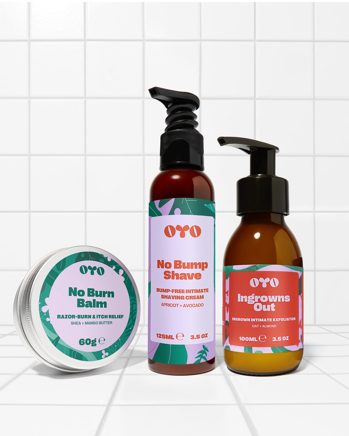 A shave that loves your skin back. This 3-step ritual clears the path, cushions every glide, and melts in after to keep your skin soft, soothed, and thriving. Ingrowns Out preps the skin by lifting away buildup, No Bump Shave wraps every stroke in moisture for a silky, irritation-free glide, and No Burn Balm seals in comfort, leaving nothing behind but smooth, buttery-soft skin.